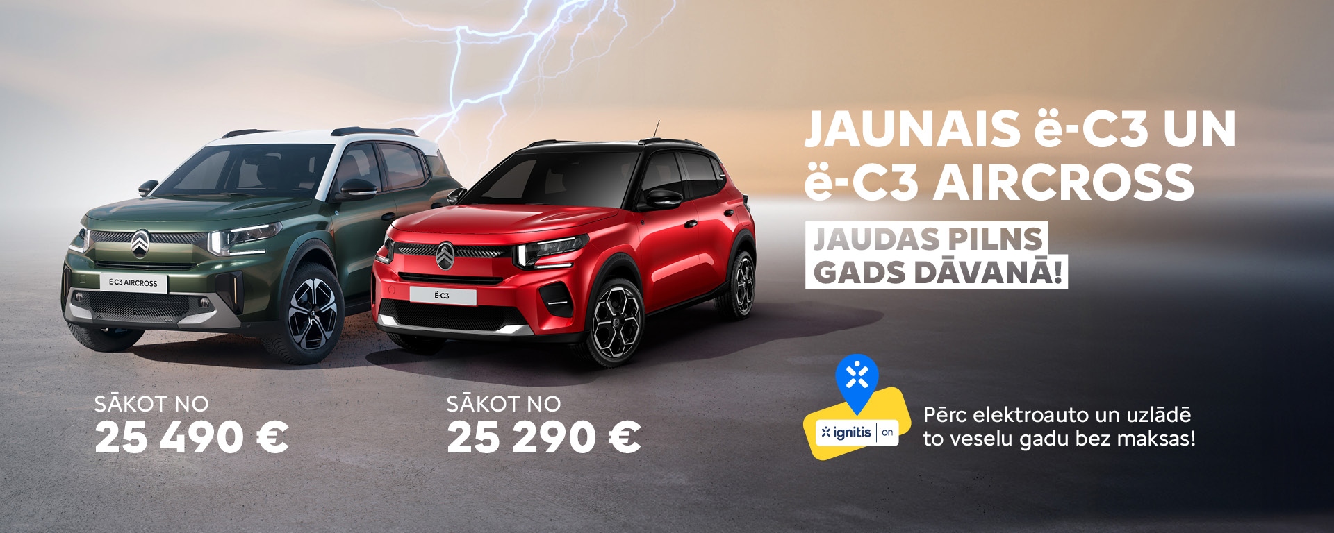 Iegādājoties jaunu Citroën ë-C3 vai ë-C3 Aircross elektromobili, saņemsiet karti bezmaksas uzlādes veikšanai.
