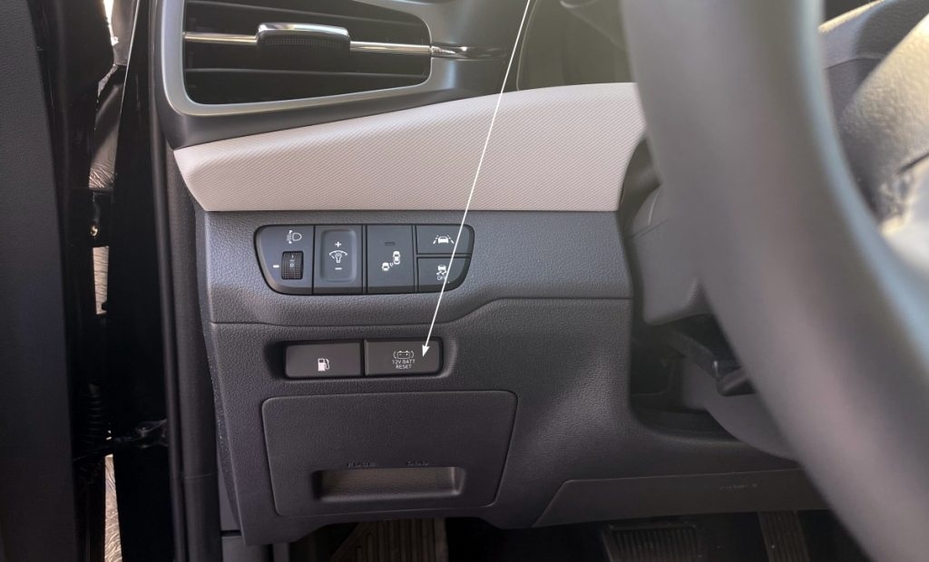 Гибридные модели Hyundai оснащены кнопкой повторного включения аккумулятора 12 В, расположенной слева и внизу от руля. Когда заряда автомобильного аккумулятора уже недостаточно для нормальной эксплуатации автомобиля, его можно принудительно включить, нажав на эту кнопку.